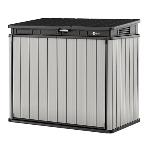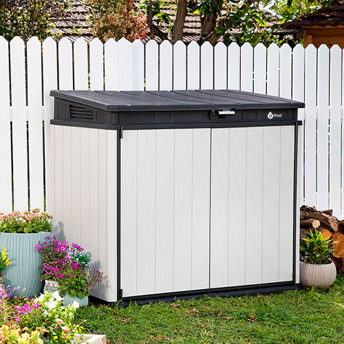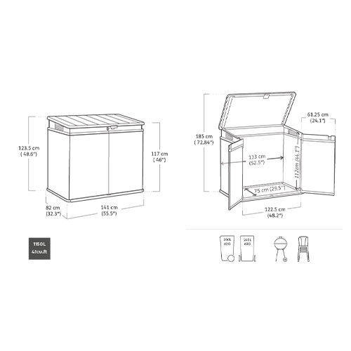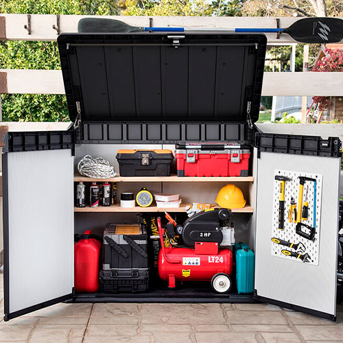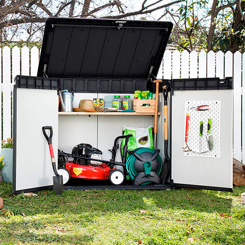 Su capacidad de 1150 litros (41 pies cúbicos) la hace ideal para almacenar barbacoas, equipos de jardinería y otros objetos.