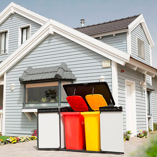 Con una tapa fácil de abrir accionada por pistones hidráulicos y un kit de apertura de contenedor, es perfecta para almacenar dos cubos de basura de 240 litros (63 galones).